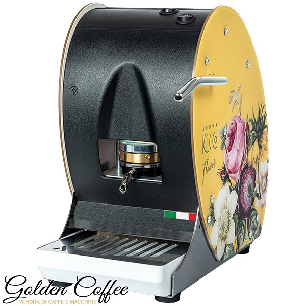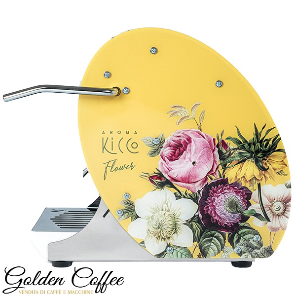 L’Aroma Kicco Flower è una variante della macchina da caffè in cialda Kicco, nota per le delicate decorazioni floreali sulle scocche, disponibili nei colori giallo e rosa.